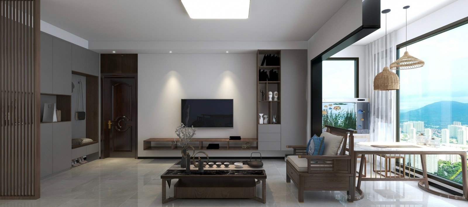 客厅的设计简单为主,简约大气,客厅的设计是把,胡桃木格栅的设计也是一大亮点,生活阳台打通,显得整个空间视野更加的开阔,鱼缸的设计,寓意主人财源广进,年年有余