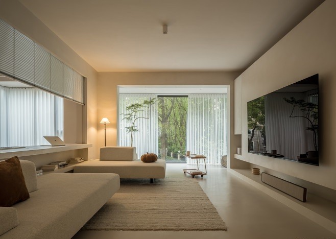业主房屋位于二层,被绿植环绕包裹,加之屋主喜好极简干净的空间氛围,所以将空间整体基调定为温和米色调,采用墙、顶、地一体的设计,打造被温暖和纯净的氛围包裹的柔和空间,辅以窗外野性自然的绿意,呈现出一种返璞归真般质朴古拙的韵味。