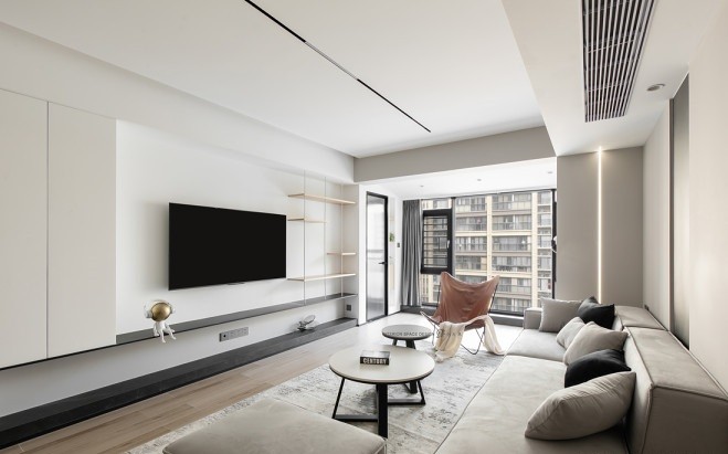本案以木饰面和低饱和色为主要设计元素,设计手法上采用空问贯穿式和视觉连贯式使整个空间具有延伸性,视觉上更加开阔。室内整体沿用较简洁的设计语言,摒奔传统的奢华,以更加简约的元素来彰显极简生活态度。