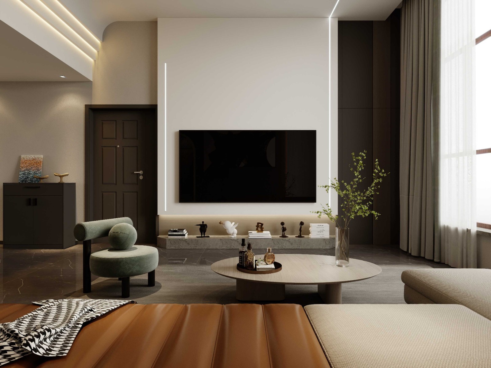 整体风格为现代,以深色和白色局部背景为橙色点缀。