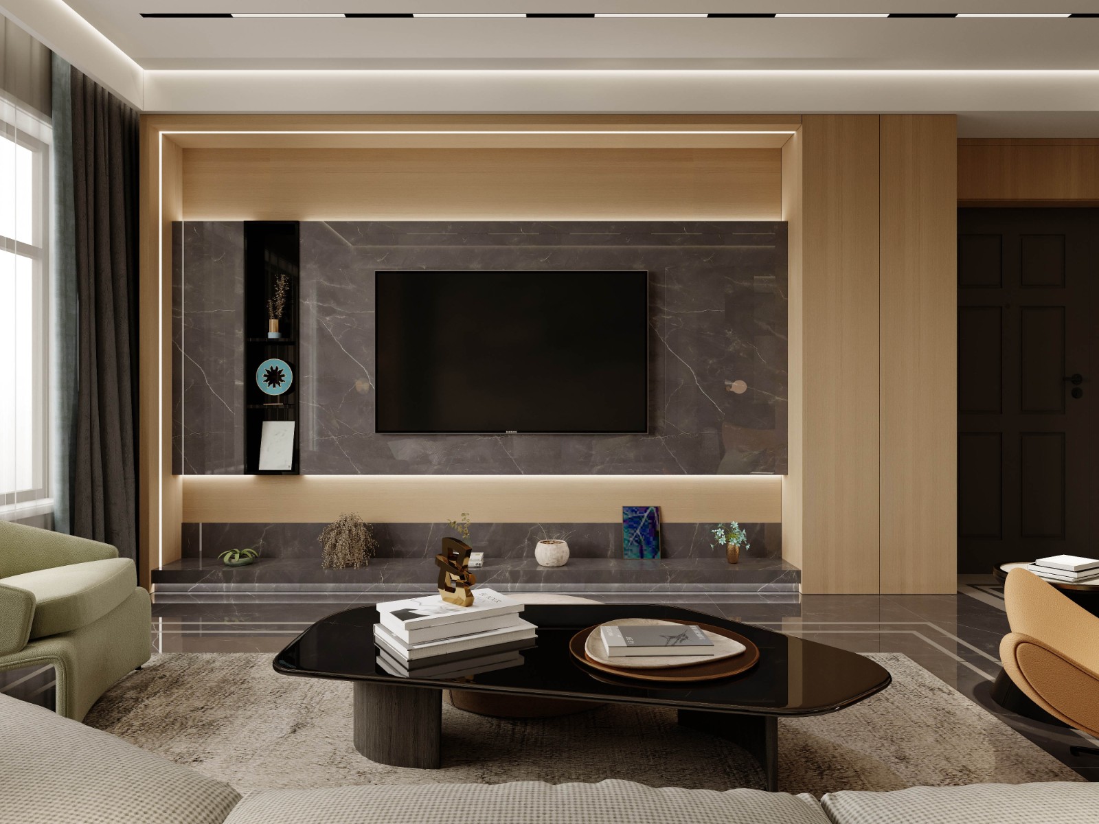 整体无主灯设计,木纹与石材结合。