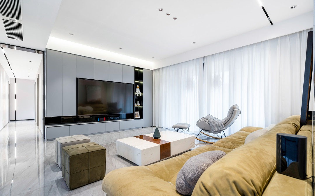 令人羡慕的客厅进深和大幅落地窗已经赢了,其他任何装点都会是锦上添花。 大空间的收纳更是刚需,而且更需要隐藏,以保证其宽阔的视觉感得以保持,因此我们做了电视柜取代电视背景墙。