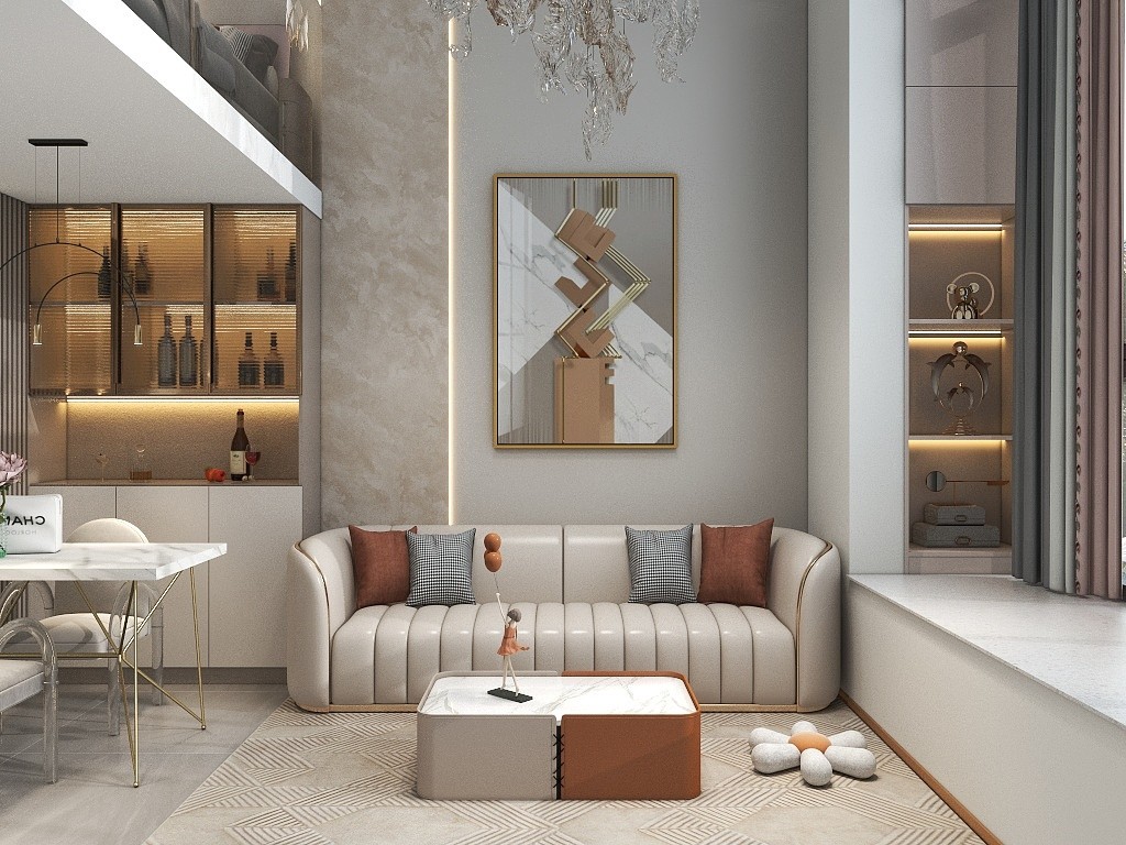 35平loft毛坯装修,轻奢搭配沙发背景墙床头背景墙,顶面无主灯吊顶