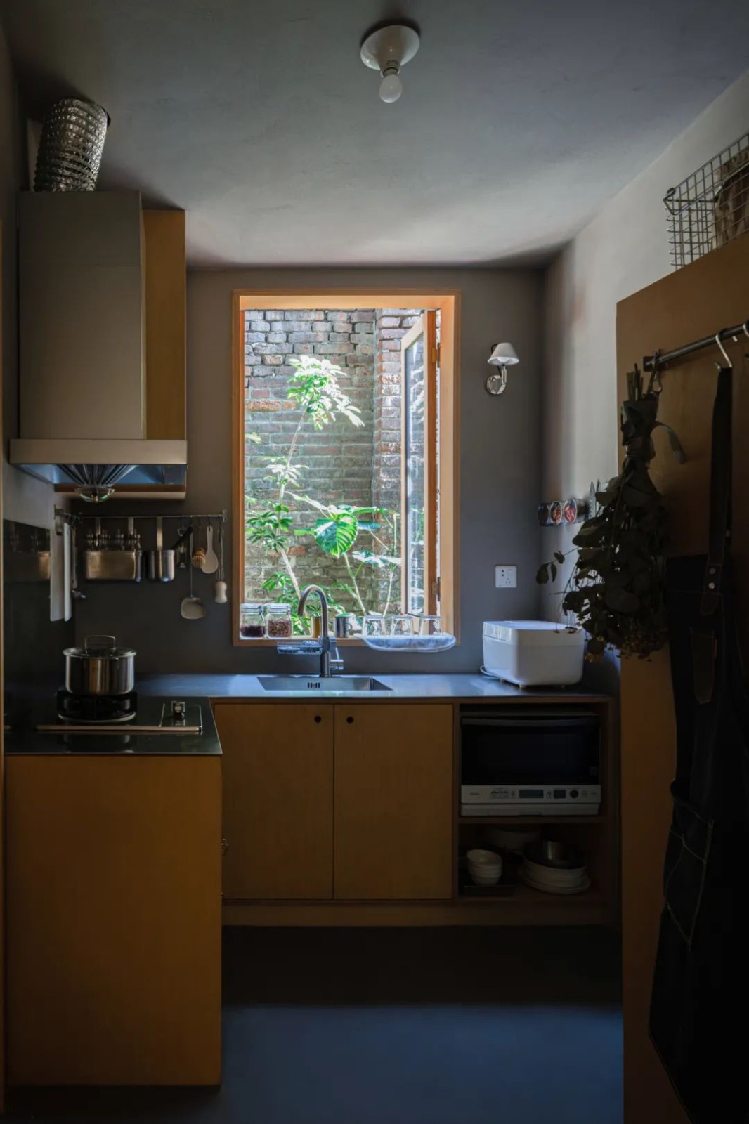 由于原始户型受限,厨房同时是入户、通往卫生间和进出办公区域的中转空间。因此要在满足厨房基本功能的同时过道必须要通畅。需要对橱柜的尺度做适当调整,几番验证后觉得520mm的深度较为合适。厨房的窗户虽然离红砖围墙很近,但是有了绿植后,每天推开窗户,做饭的同时也能享受到自然的亲切。