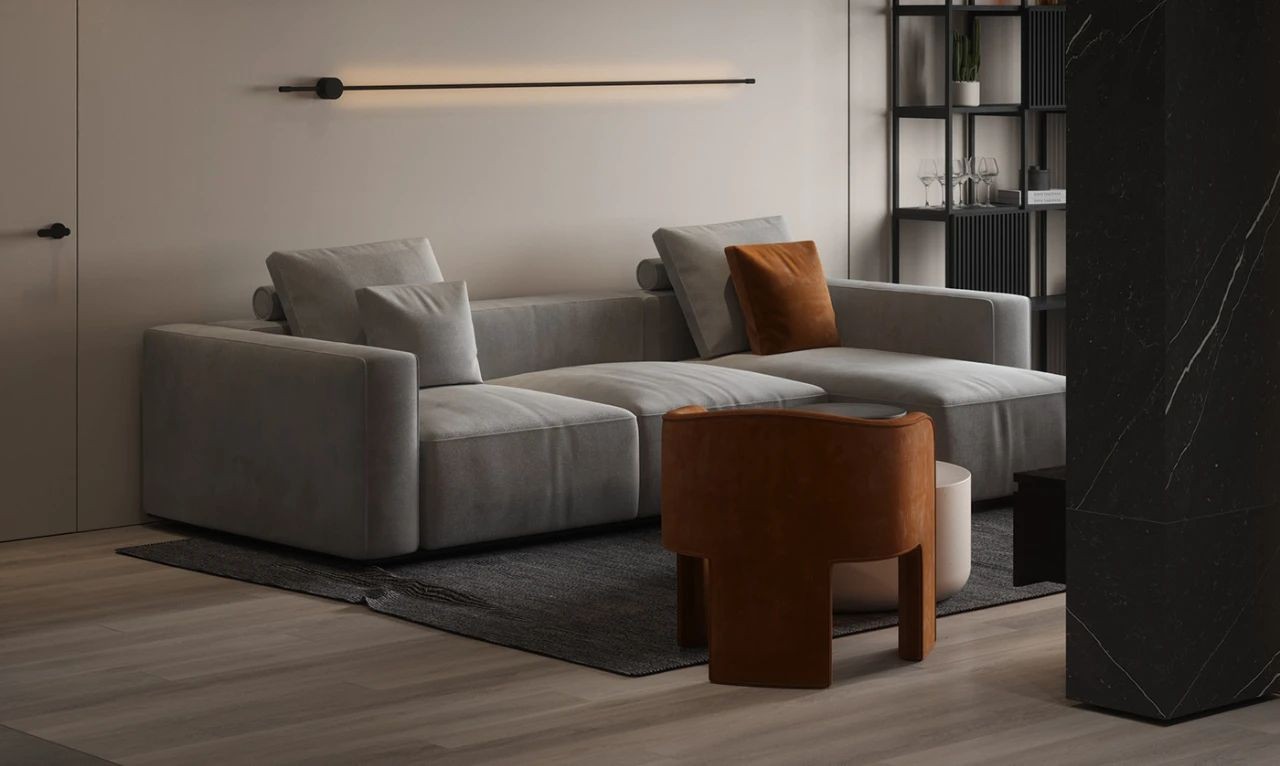 浅灰色休闲沙发突出舒适感 用橙色作为软装的跳色 赋予空间一种沉稳的魅力 线型壁灯彰显艺术性 成为沙发背景的点睛之笔