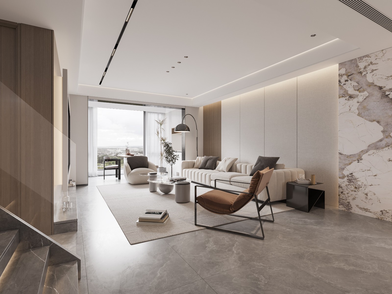 客厅地面选择了暖灰色的大砖,600*1200大气又与整体的色调形成对比