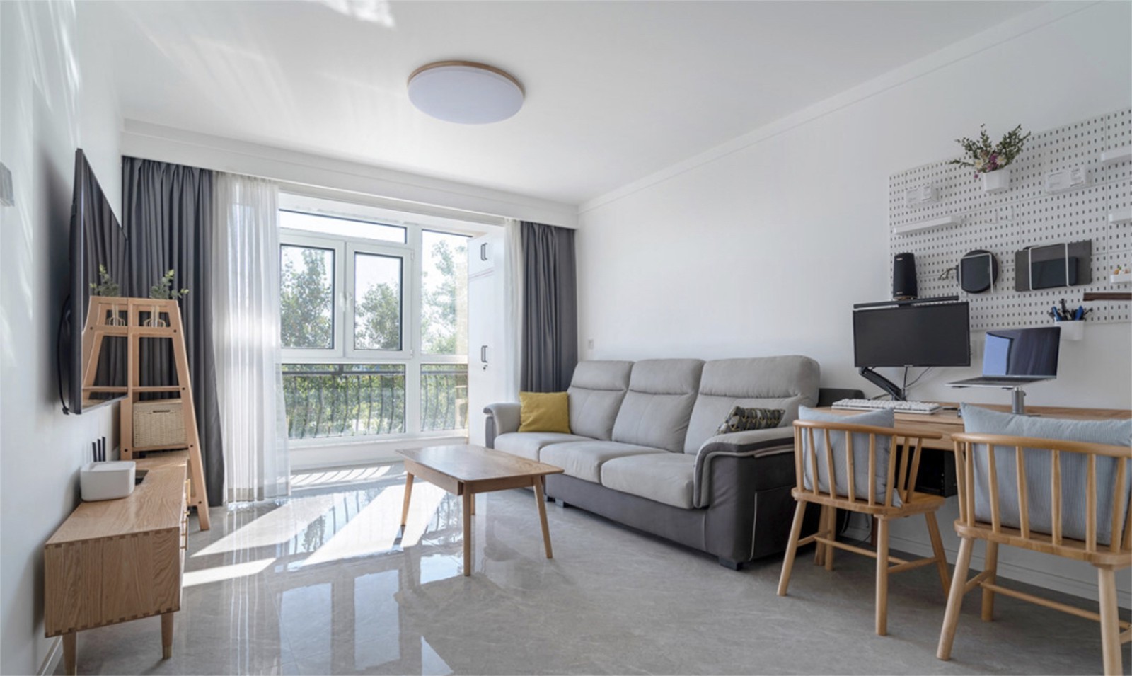 室整体以白与原木为主,窗帘增加了一点既视感的爱马仕橘色,丰富空间的色彩。
