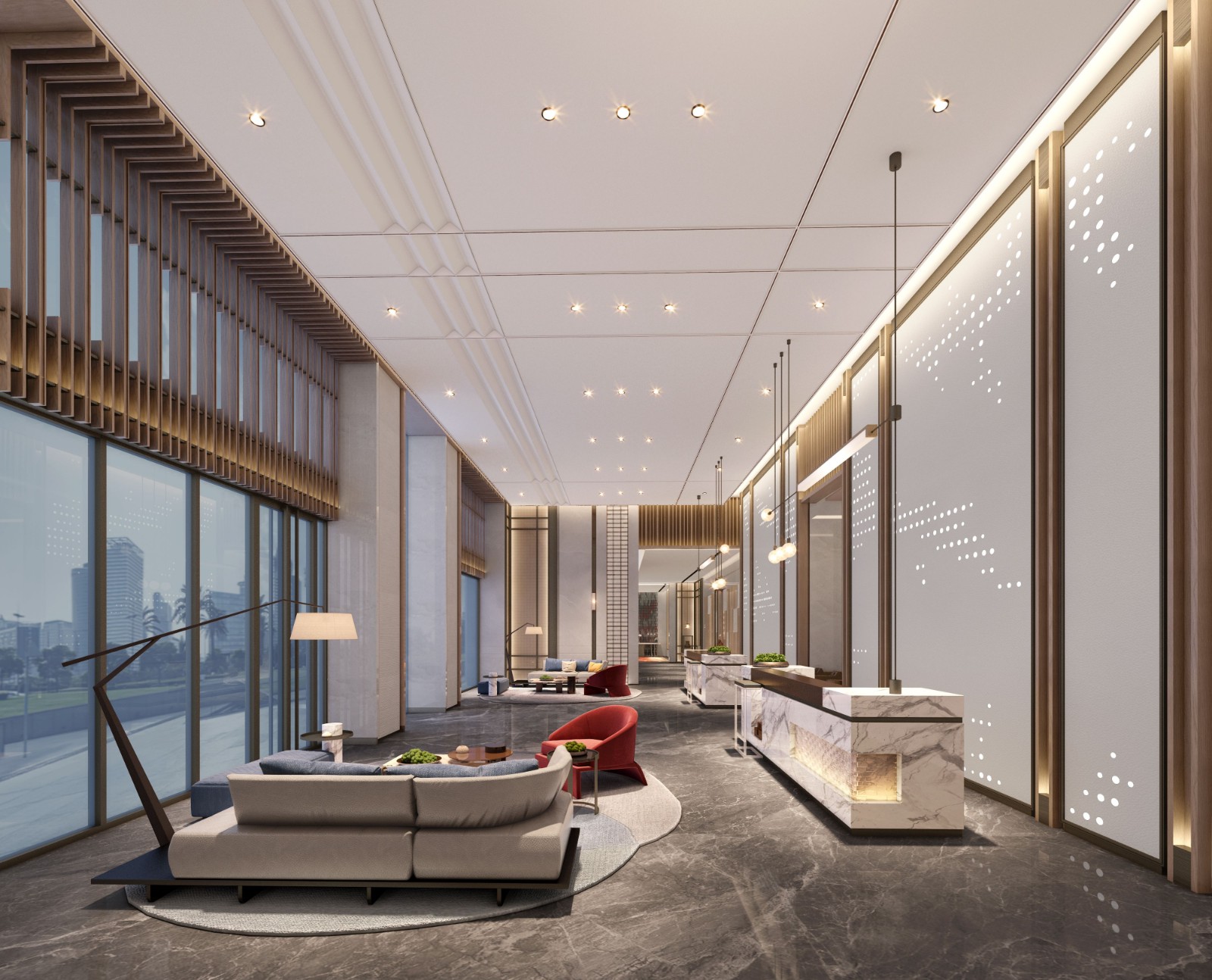 我们使用白色墙体,深灰色地砖为主,突出空间的视觉宽广和环境的干净整洁。使用局部分的黄铜色的装饰,增加整体的光感视觉。使用简单的吊灯搭配偏暖光的灯光,增加温馨感。公共区搭配亮色的桌椅,增加色彩感。