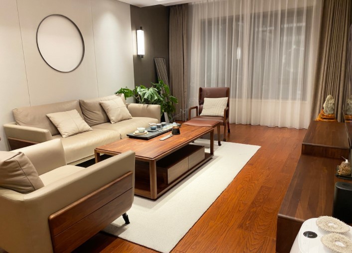 三人位沙发、电视机两侧通过绿植、小圆凳搭配,寥寥几处小装饰与木质桌椅、地板、皮质沙发相搭配,体现出新中式的简约大方的风格。