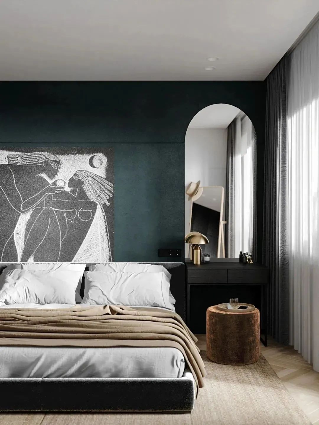 卧室以墨绿色作为背景,黑白装饰画、流畅的线条,多种材质的软装让层次更加丰富。