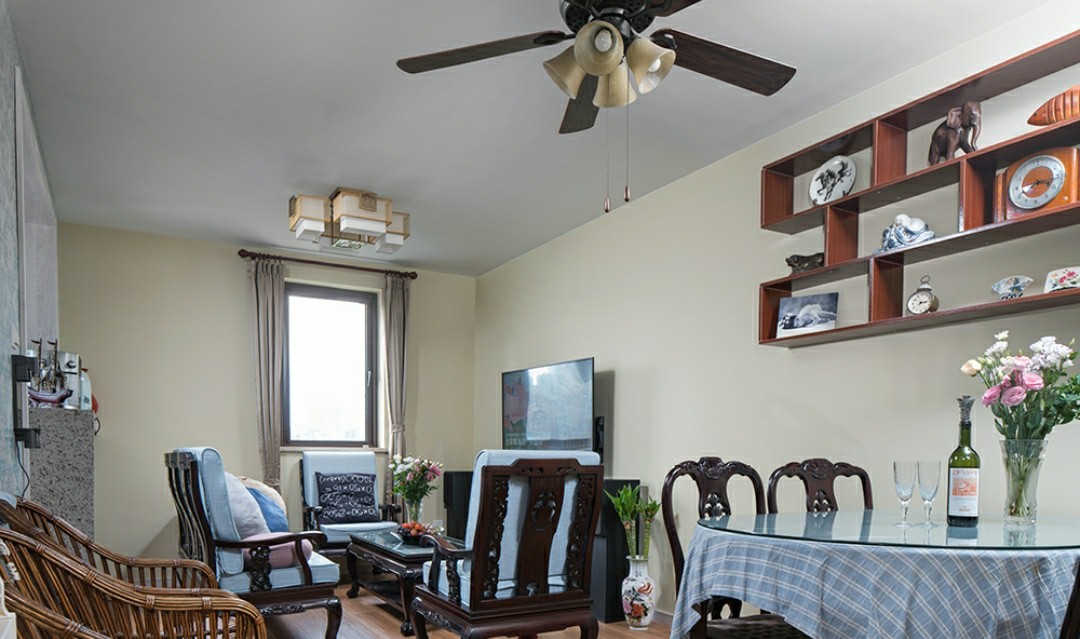 客厅旁边的门推开后就是母亲的家,客餐厅保留了原本所有的家具。将原来桌子和沙发的位置改变一下,将餐桌利用起来。