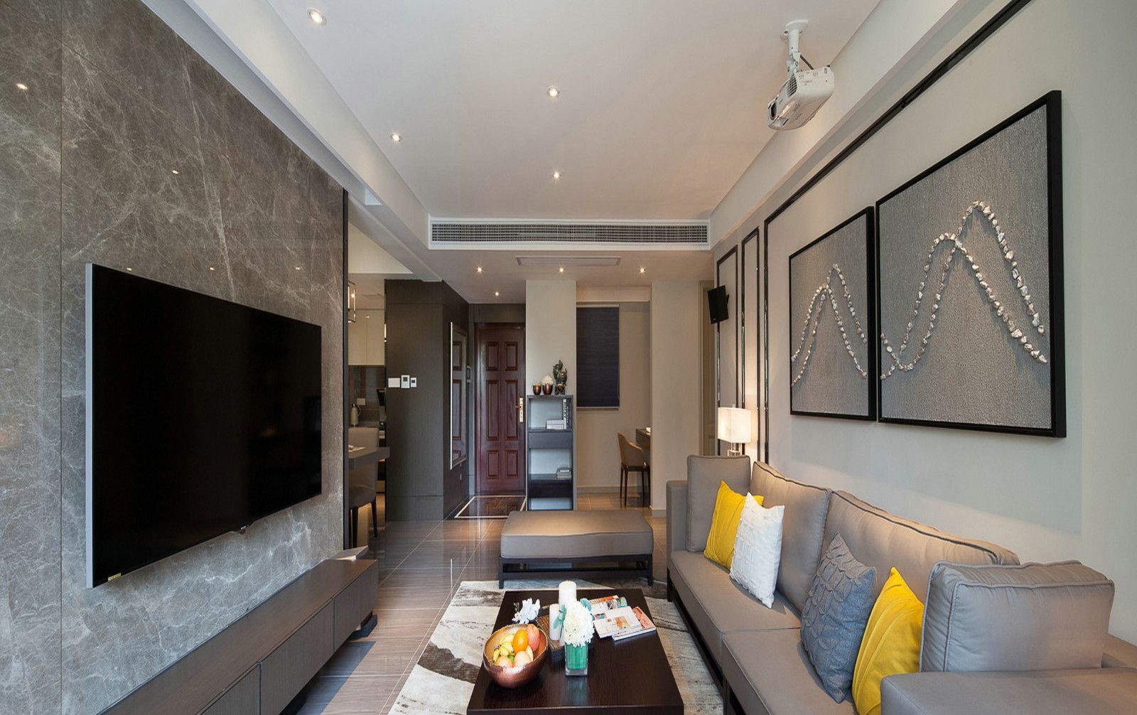 客厅为家人交流的主要场所,根据前期对业主颜色喜好了解,大体为灰色系。添加了投影,对面暗藏了投影幕布,表面只看到灯槽,使用的时候放下来,比较美观,在家就可以看电影。顶部筒灯+虚光灯带、减去主灯光源,让本来不是很大的区域增加视野。空间动线安排合理,利用率高。