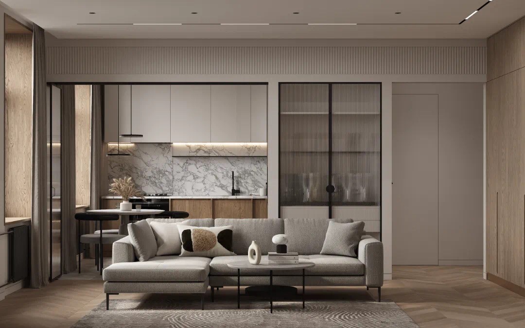 客厅主打深色主题,用温柔的烟熏橡木刻画空间深邃而富有意蕴的空间情感。