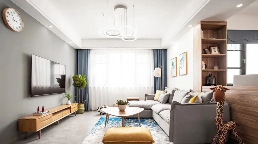 客厅空间以灰色和白色为底色,简洁明亮而不失优雅气质。原木电视柜、茶几和沙发背后的定制柜,中了灰色的清冷,也增添了家的自然温馨感。