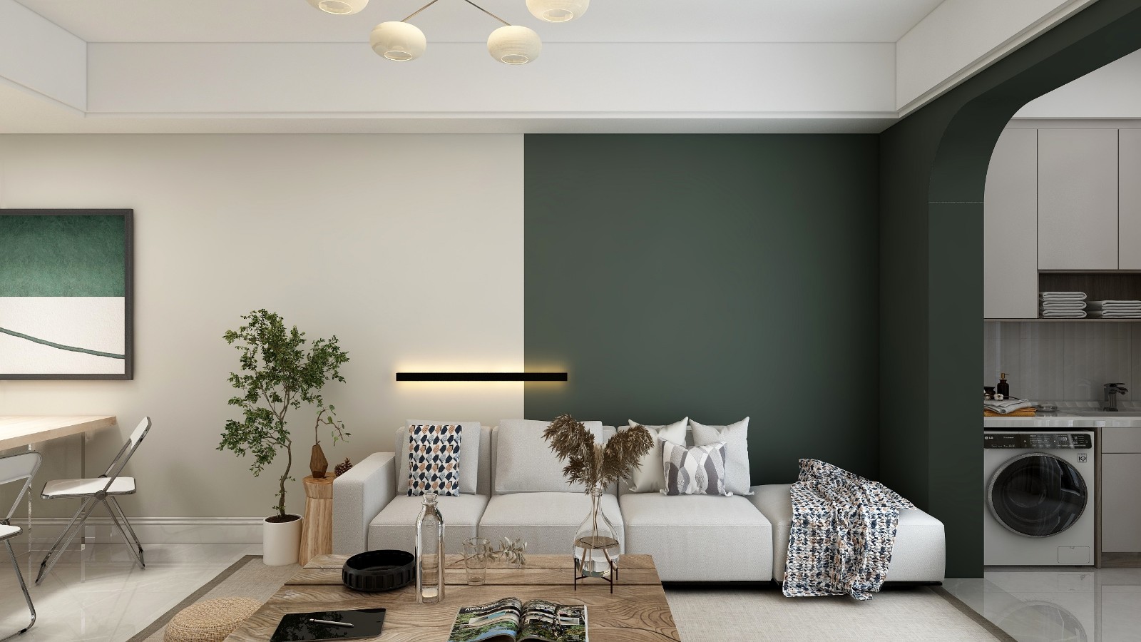 餐厅的挂画和背景的绿相呼应。 整个空间统一而整体。