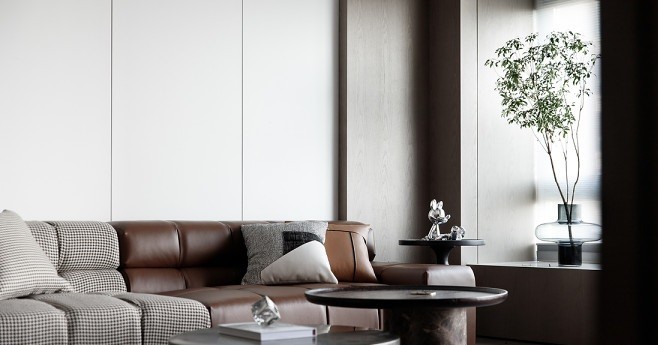 空间色彩白与咖的碰撞,优雅、朴素、庄重而不失雅致;家具材质,沙发布艺与真皮的拼接舒适且充满质感。