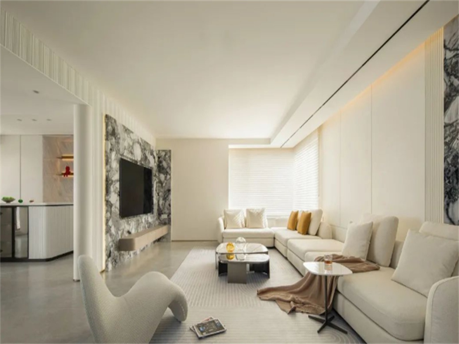 大理石电视墙质感硬朗大气,开放式客餐厨格局,让空间有更好的交流互动