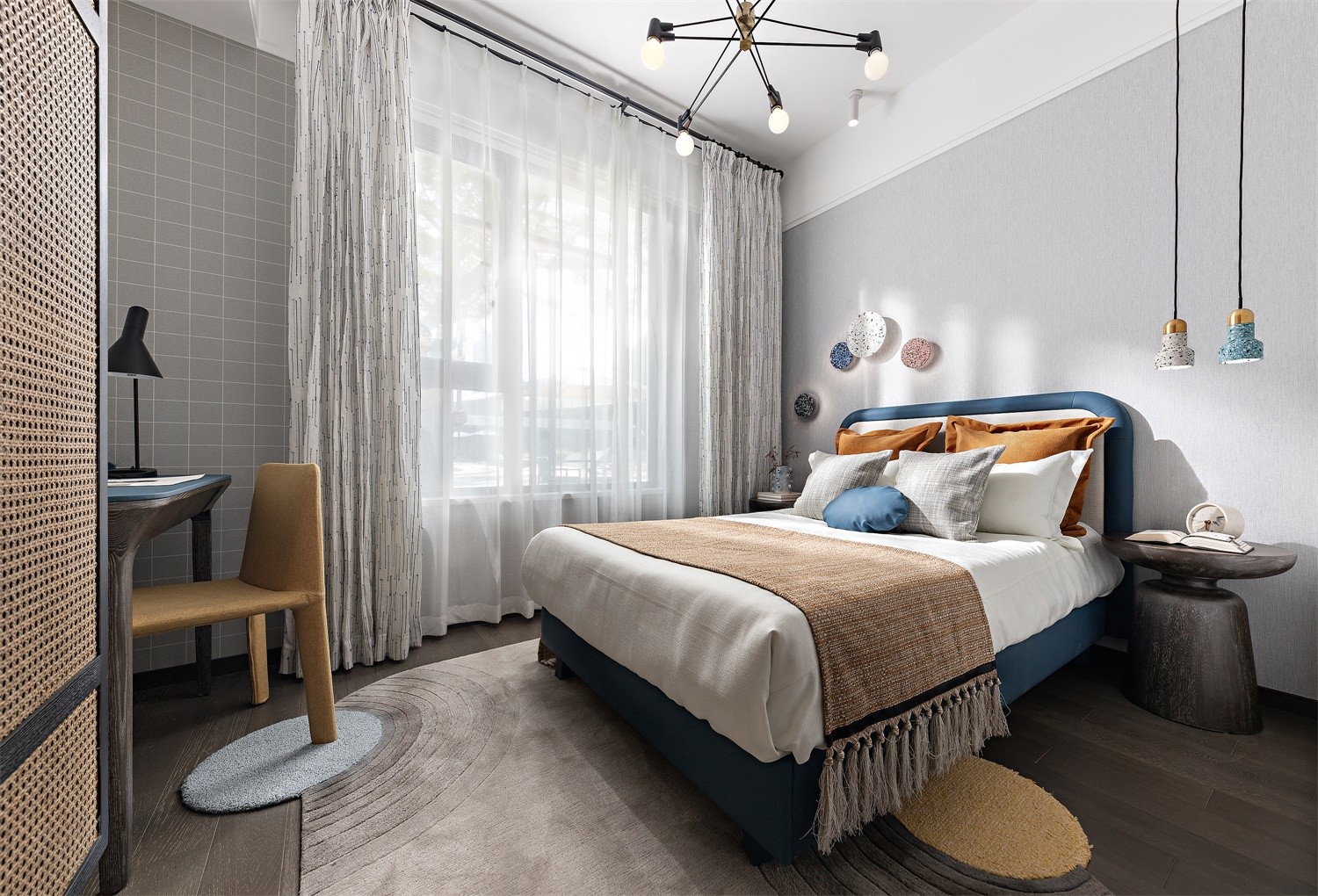 卧室装修风格延续客厅的方式,用竖条纹和有特色的灯具打造温润宜居的感受。