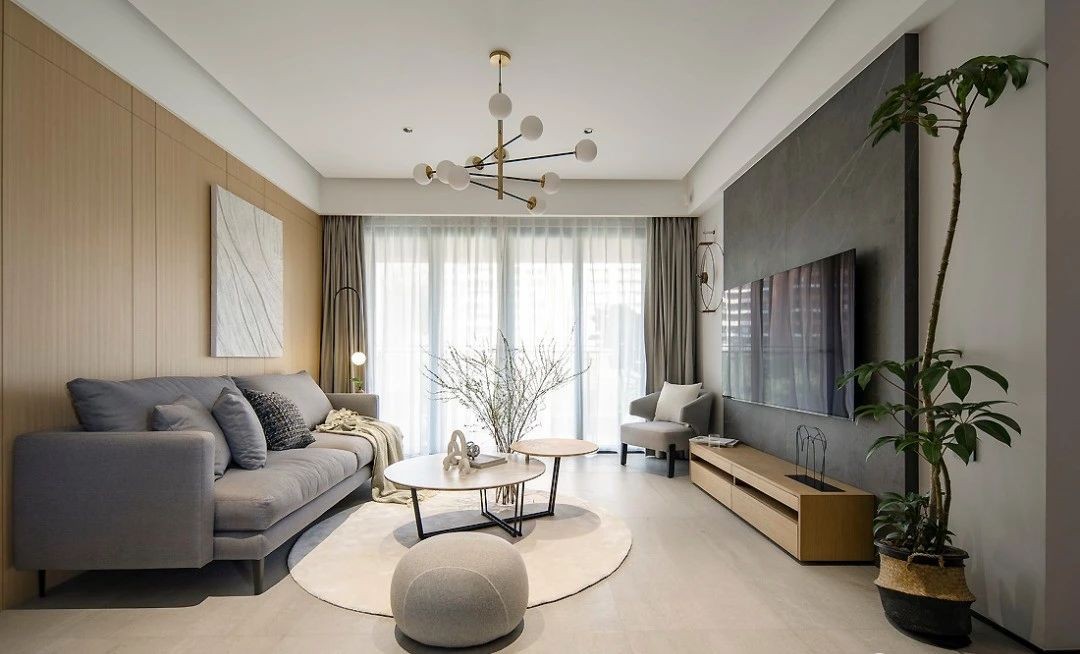 深灰色布艺沙发在色调上与电视背景墙岩板相呼应,高低错落有致的圆形白色大理石茶几点亮空间,绿植的存在让这个区域瞬间生气起来。木饰面背景墙将沙发区域包围,包括门的材质保持一致性,让沙发背景墙形成一个整体。 别致的挂画,素色简单的披毯,造型有趣的落地灯 ... 软装也是为这个家增色的重要组成。
