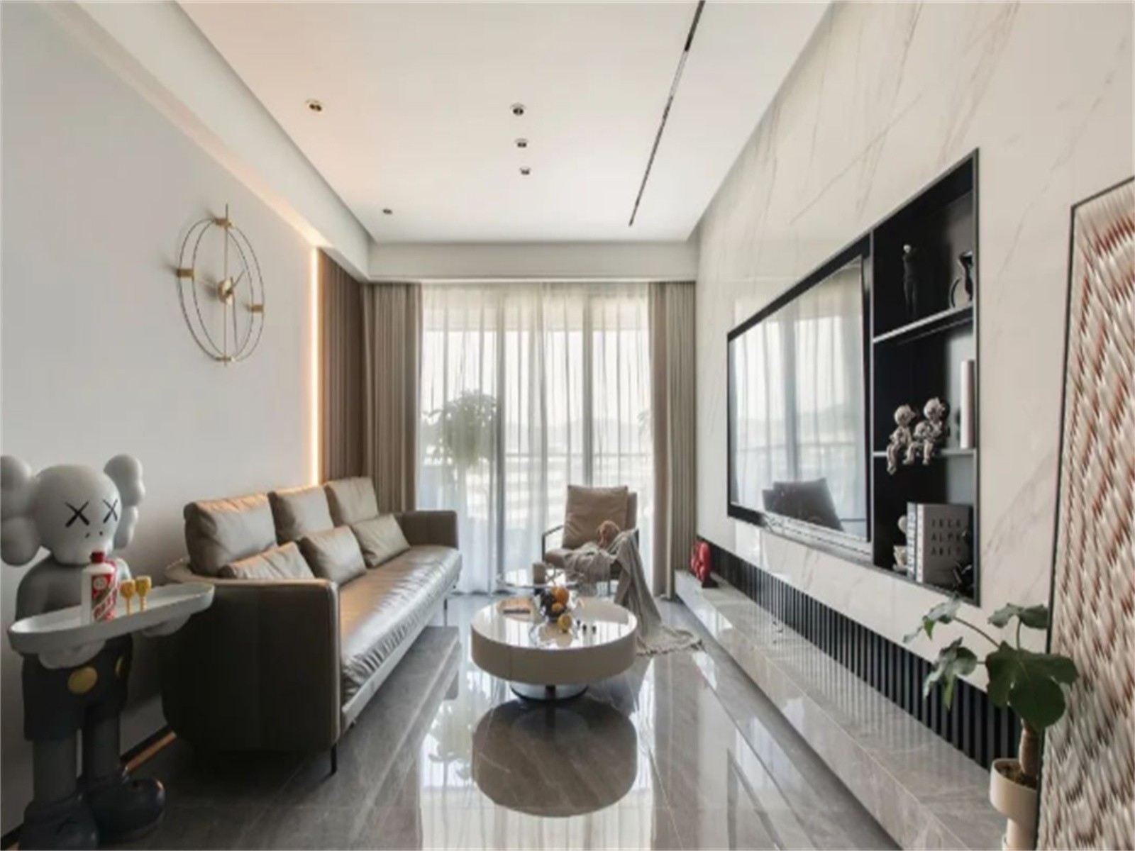 大理石电视墙质感硬朗,并将电视机完美嵌入,经典的黑白配色富有层次,下方增设地台取代传统电视柜