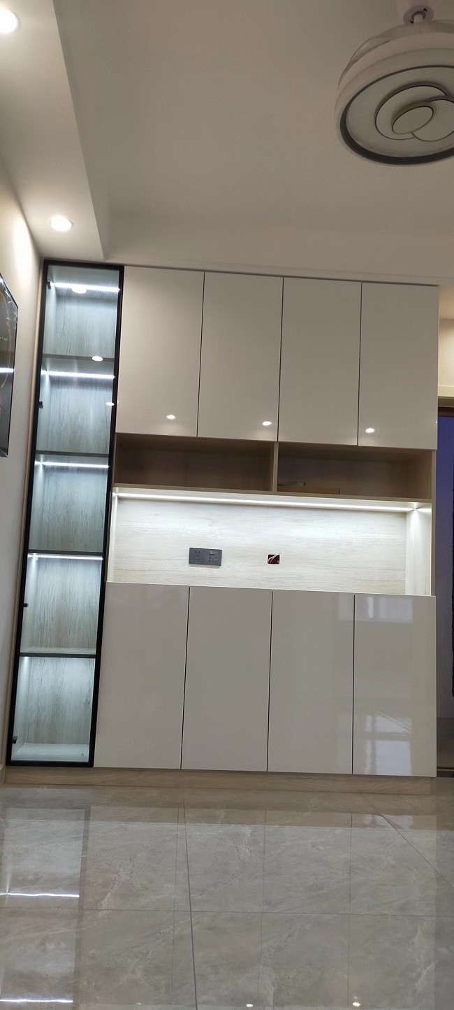 客餐厅餐边柜及书架柜体内嵌灯带,搭配玻璃门板,实用有质感
