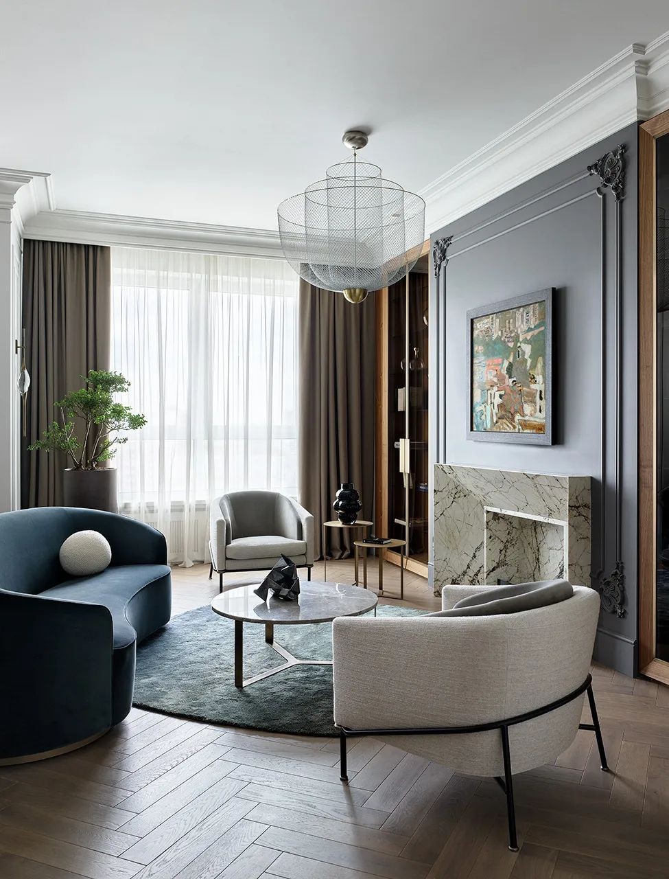 在墙壁和家具的装饰中选择的浅色柔和的色彩照亮了空间,而深色调和高贵的材料为其增添了必要的对比和深度