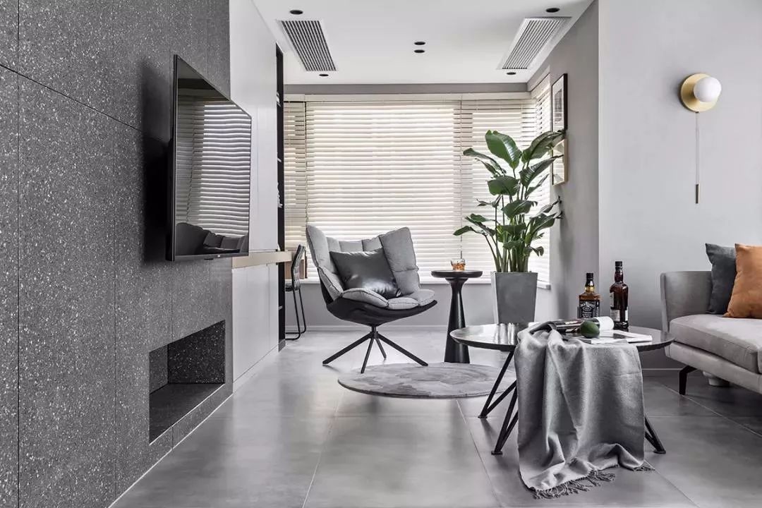 客厅将灰调运用的淋漓尽致,茶几与沙发椅皆由灰黑色交织,简约大气。以灰色+白色收纳为背景的电视墙,挂上黑色电视机,形成了一个独特而又鲜明的视觉感。