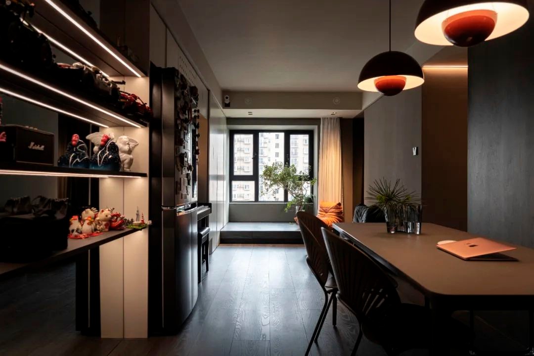 客餐一体,通过柜体延伸到阳台,满足了储物需求,也让两个空间有了联结。