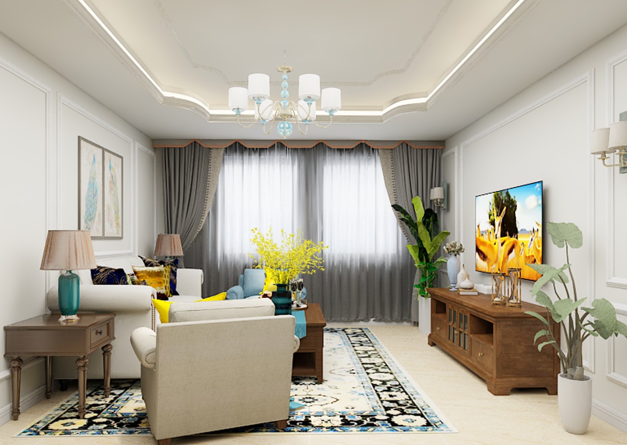 客厅,硬装上的吊顶体现出了风格特点,软装家具根据风格来搭配的。