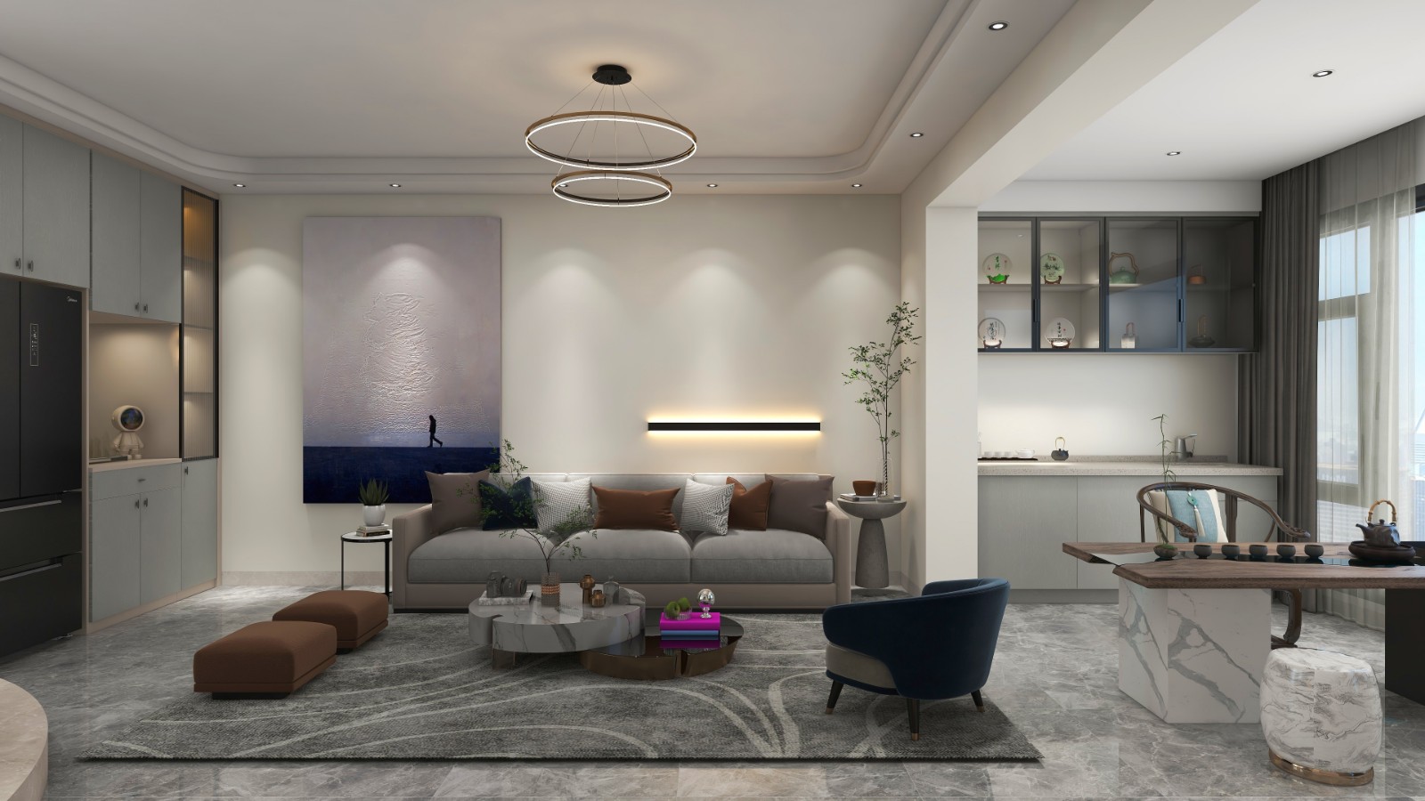 客厅整体和餐厅、阳台做了联动打通,背景墙以浅木色长城纹基调,搭配颜色明亮岩板装饰,大理石纹地砖与鹤望兰营造自然舒适氛围。用茶台巧妙划分阳台区域,空间通透感十足采光效果。