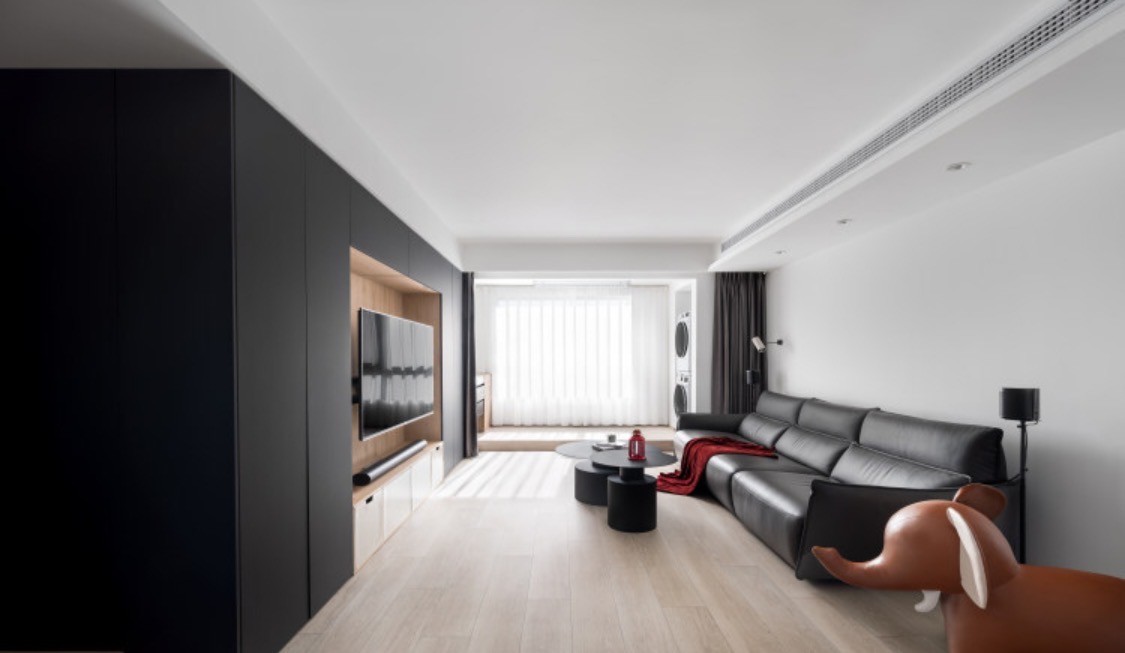 客厅区域整体简洁利落,以黑白色调铺陈,皮革、原木为辅助,重塑极简温馨的家庭氛围。