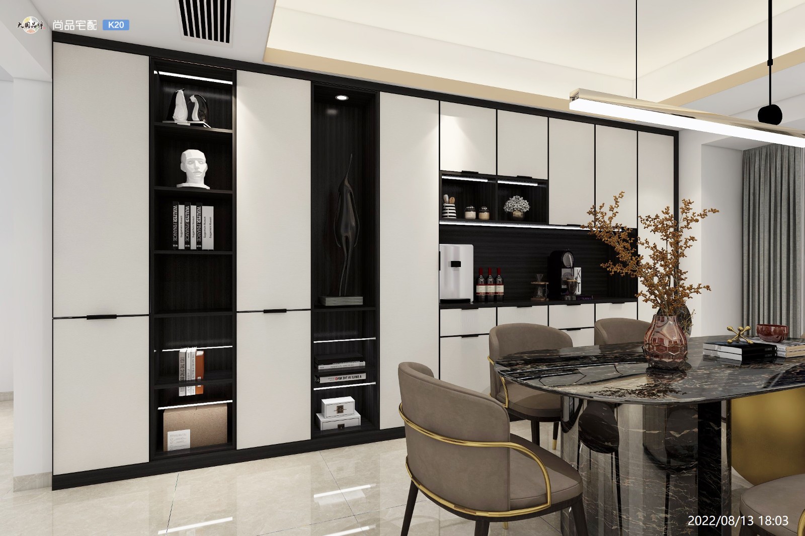 满墙餐边柜的开放和封闭,根据整体空间来协调,左边可以展示更漂亮的餐厅用品,封闭的餐边柜将餐厅用品放在里面,可以避免灰尘的侵入,超大的容量设计使其在实用性上更胜一筹