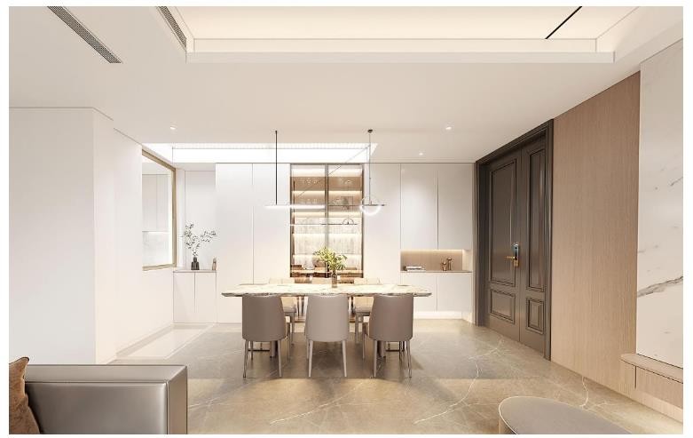 顶面预留感应天窗,保证室内通风,采光的同时也不受雨雪的烦恼。造型简洁的餐边柜解决实用功能外,金属玻璃门提升整体空间的奢华质感。