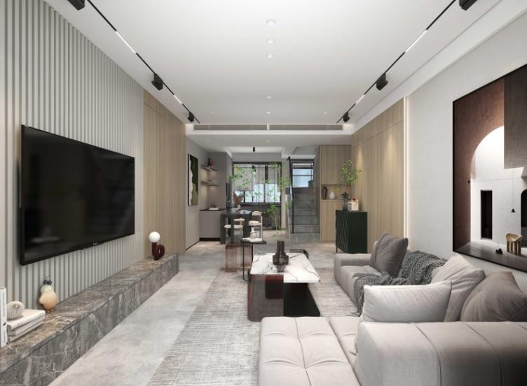 由于电视背景墙相对比较面积小视觉感官延伸性不强,利用木饰面把卧室门改成隐形门,视觉加大空间,有延展性,增加***感,沙发背景墙用太空漫步灰凸显空间,墙面局部有线条装饰,具有空间感,软装选用有棱角的家具,彰显个性,全屋使用无主灯设计,晚上回到家也可以营造氛围感,使得空间更温馨