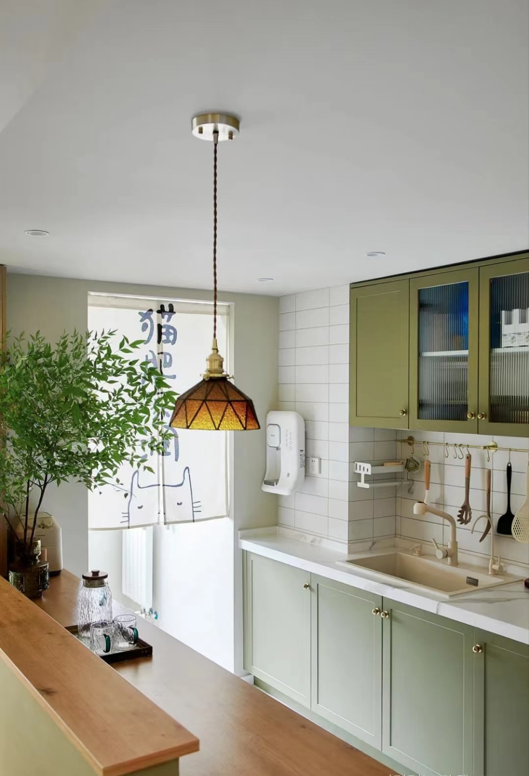 主色调是白色和橄榄绿,清新不落俗套。黄铜单品是复古风的灵魂。复古风柜门加上黄铜拉手,墙面挂上法式黄铜横杆,再点亮一盏琥珀色彩玻吊灯,生活气、精致感一下子都有了。