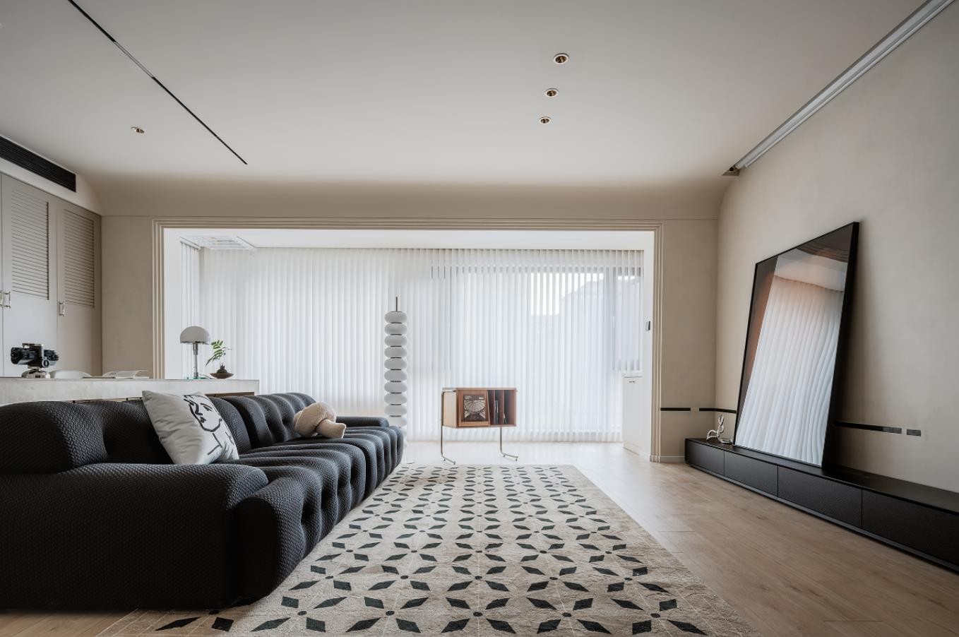 竖百叶透出朦胧清透的日光,糖葫芦落地灯搭配罗奇堡拉扣沙发,白色轻盈,黑色肃重,视觉上充实而不滞涩。