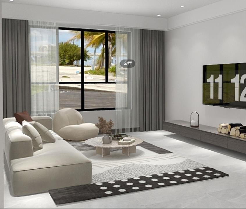 会客厅设计简约风悬空电视柜隐形门,后边是卧室,整体空间无错层,空间开阔