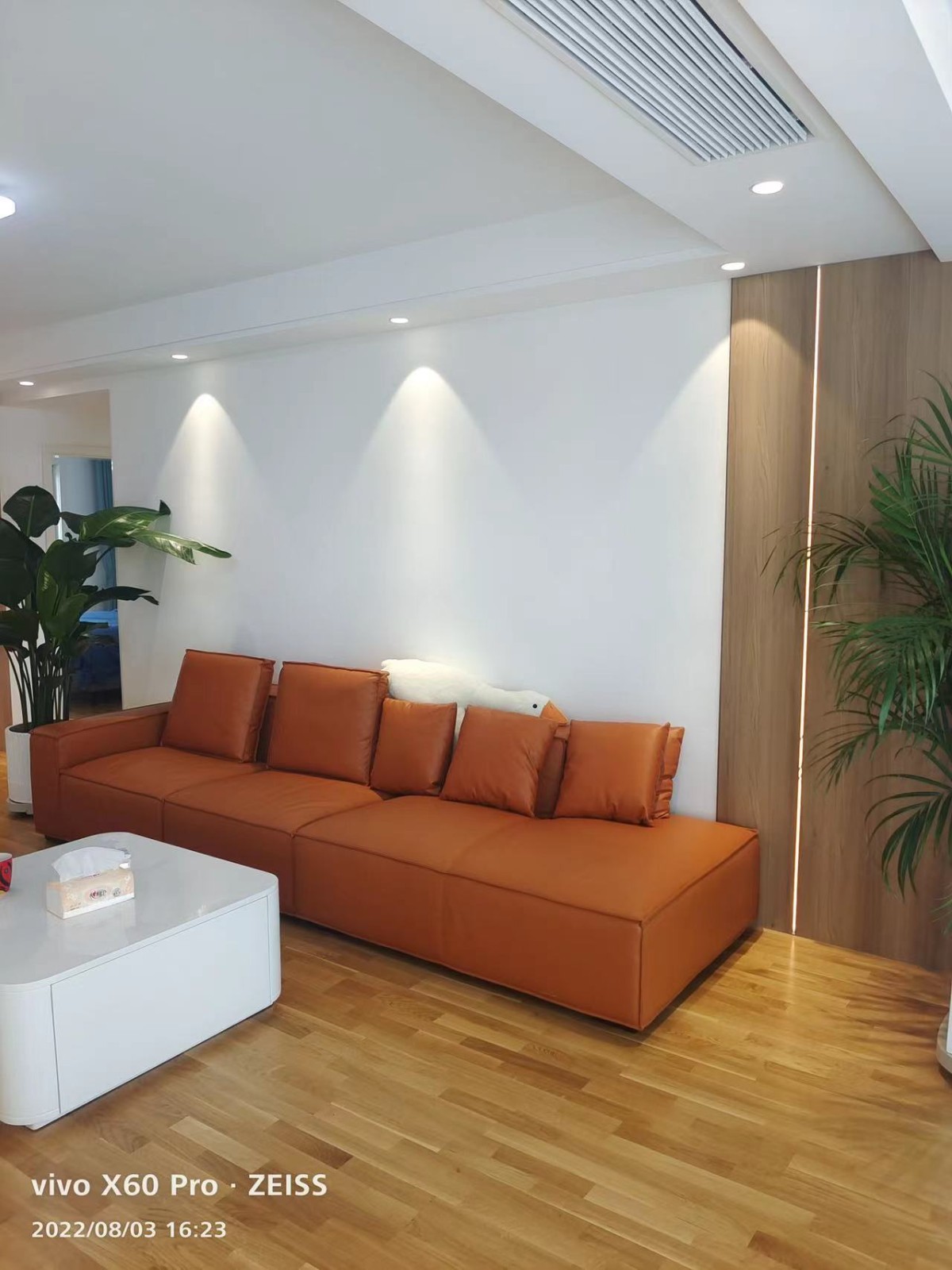 沙发背景墙搭配原木色护墙板和线型灯