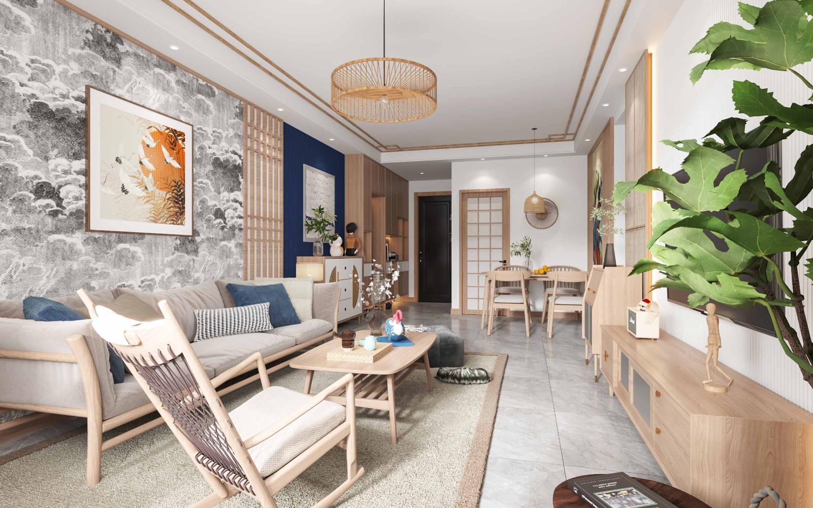 日式风格的主要特征就是具有浓厚的日本民族特色,而且线条清晰,一般布置优雅的木格拉门和地台。这种和式格局装修所用的材料,从顶面到地面都是使用最天然、朴实的材料。这种和式格局布置有着一种独特的魅力,可以表现出平和的意境。