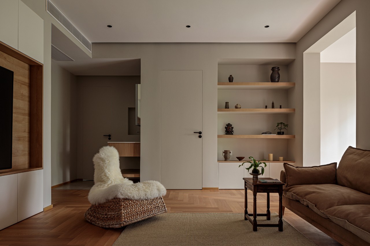 沙发一侧墙面打造了壁龛式的展示柜,并将相邻方面设计成隐形门,兼具颜值与实用性。