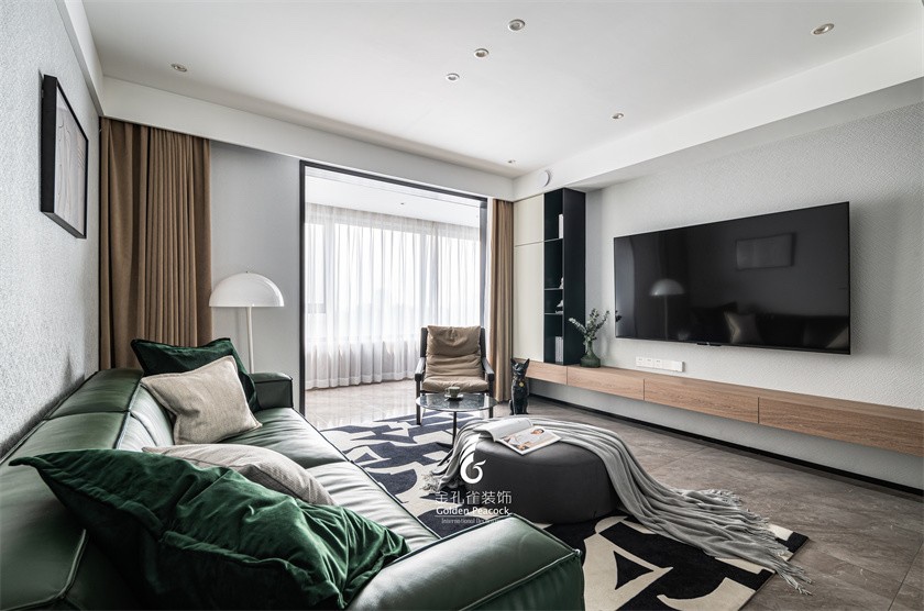 从进门就能发现,这个家的“夏意”我们交给了颜色。我们选择了一种糅合了森林大自然的“绿”,不扎眼也不过分旺盛,让人感受到浓烈的生机同时还能获得一些平和舒缓的感受。黑白纹路的地毯,墨绿色沙发,卡其色单人椅,可爱撩人的迷你型小圆几,绵软到令人忘却一切烦恼的蒲团坐墩,搭配上青葱的绿植,不费力的悠闲轻松的氛围感。