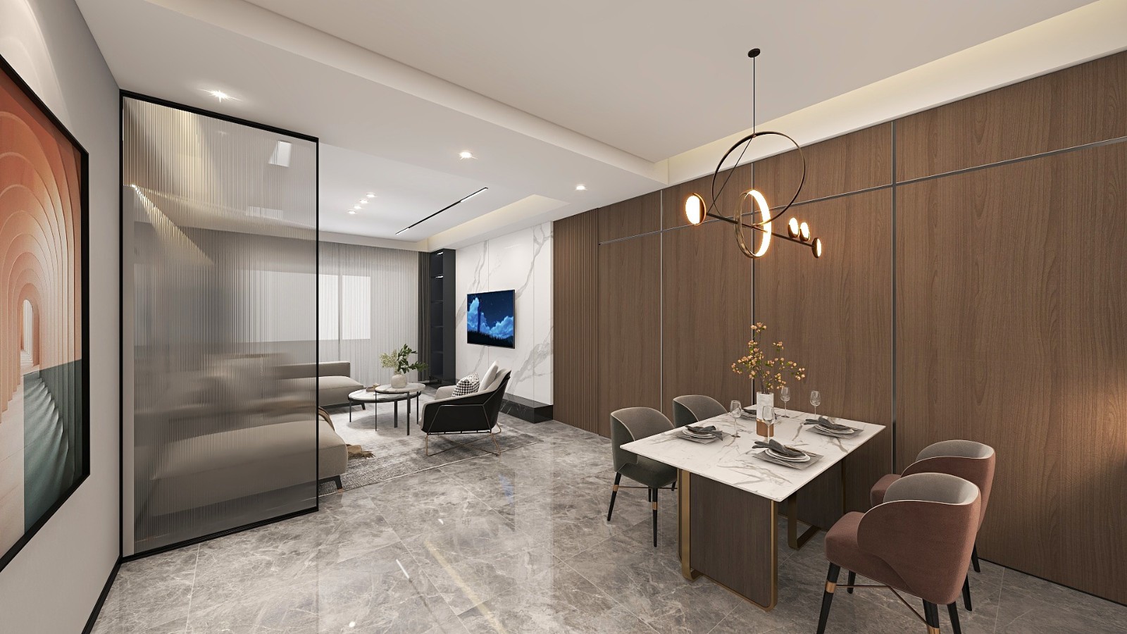本户型为三室两厅户型,根据与业主的沟通得出的此方案,由于业主不需要三个卧室,所以第三个卧室设计为下翻床,平时不用的时候可以当做书房来用,当有客人来居住的时候,也可以当成客房,一举两得,并且客厅和次卫之间用了隐形门处理,显示的电视背景墙比较修长,并且背景墙用了岩板、格栅、木饰面作为主要材质,施工完成后业主非常满意。