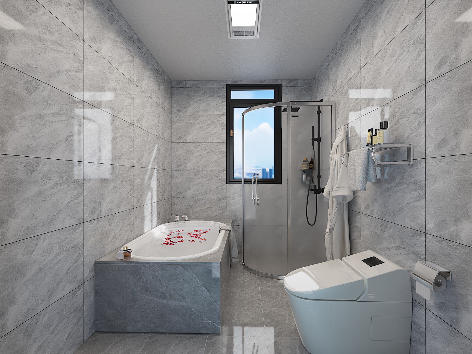 卫生间,干湿分离,湿区马桶花洒浴缸和淋浴隔断。