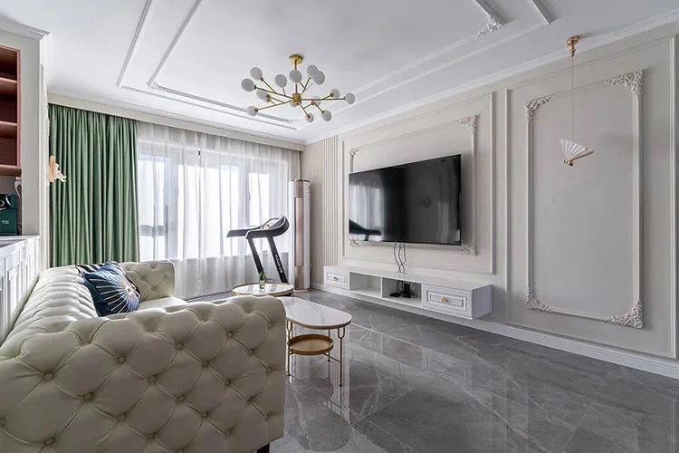 电视墙回字形的pu装饰线,统一为60cm宽。高低错落的精致线条,将墙面质感直接拉满,让空间更有层次。