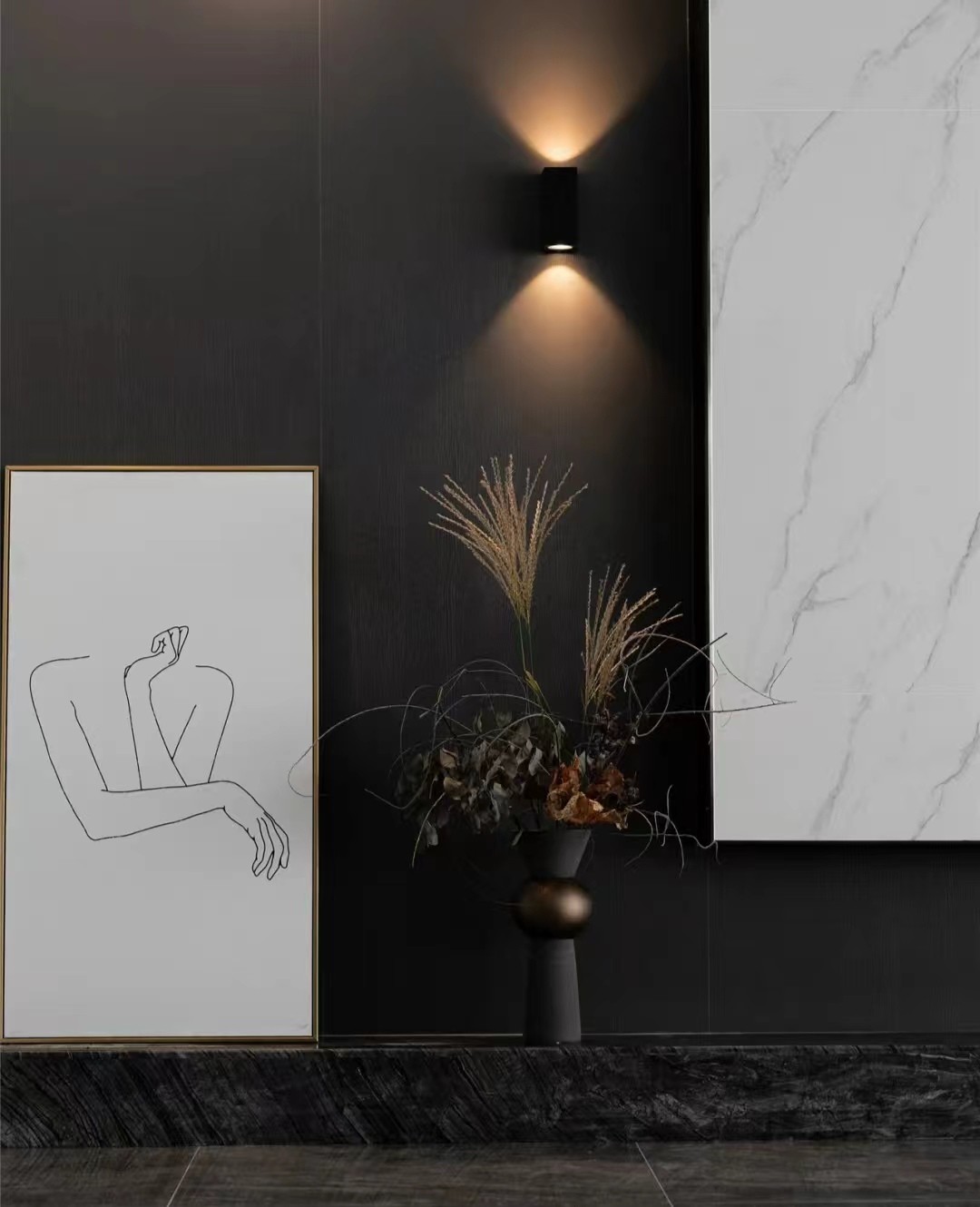 主卧延续黑白灰风格,背景墙设置颇有新意,深灰色乳胶漆墙面为整体,加入长城板与大理石纹墙元素,再搭配上不对称壁灯,相辅相成