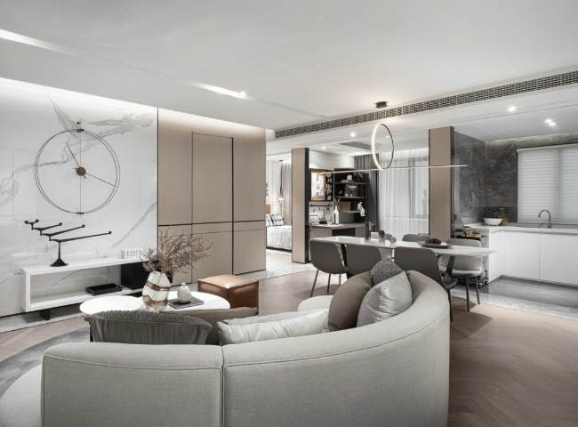 客厅空间由内而外散发出舒适感,利用带有温度感的白色,将它的百搭与精致唤起淡淡的优雅氛围