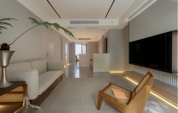 客厅踢脚线部分做了隐形灯带,提升了客厅灯光的舒适度和视觉享受,在提高室内空间立体感的同时还提升了家居的整体质感,在家即能轻松get氛围感。