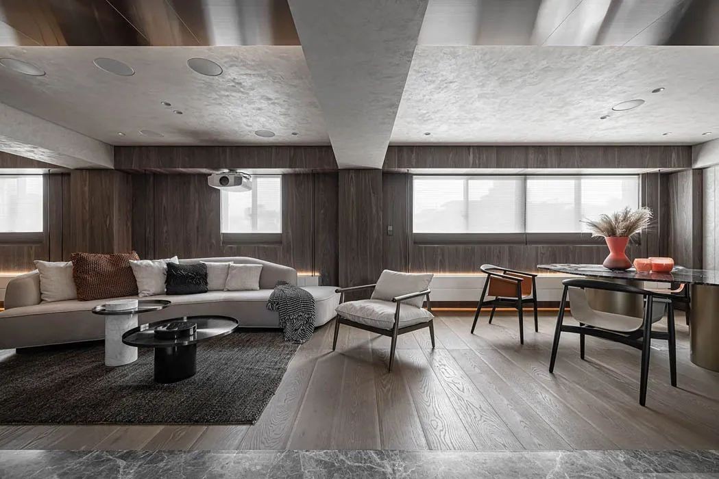 客厅主要以浅灰色和原木色为主要色调,墙面和地面都由原木装饰,营造出十足的温馨感,
