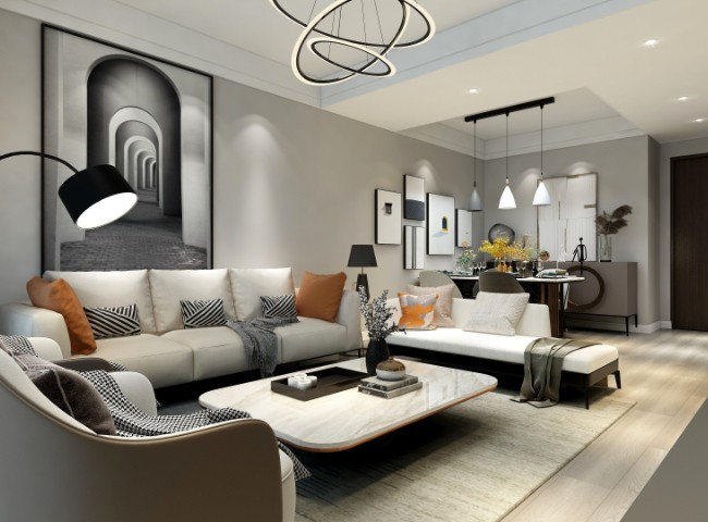 客厅选择了以灰色调为主,在软装上加入一抹温馨的橙色,让整个客厅变得更为优雅