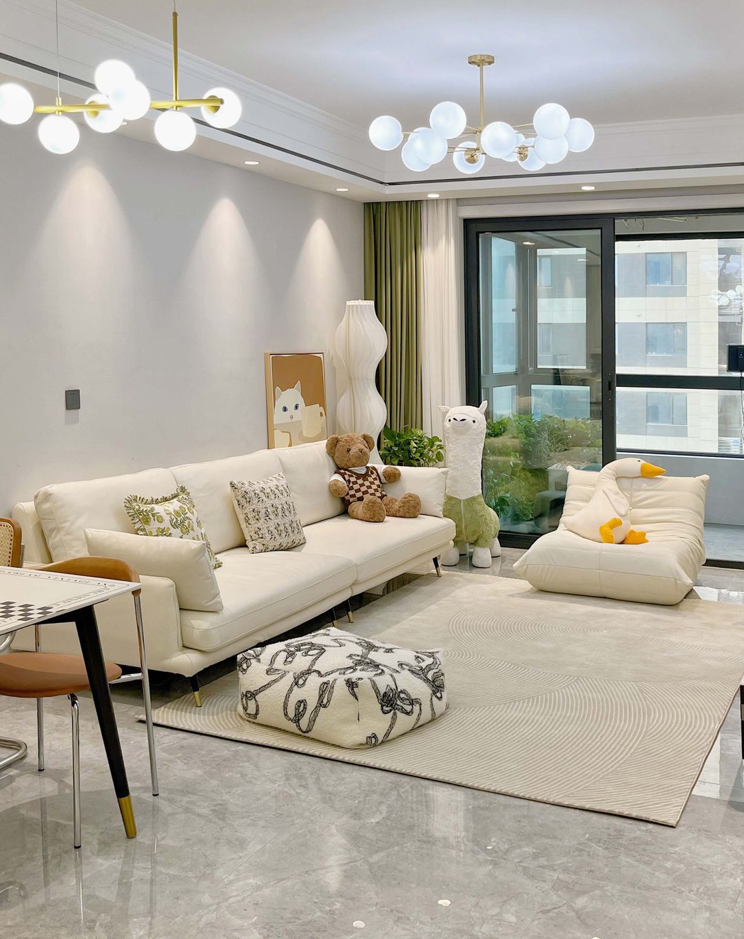 奶白色直排式沙发,仿皮质科技布面料,耐脏好打理。 空间大还好看,非常适合小户型,放上喜欢的抱枕和毛绒公仔,可爱温柔。 搭配一幅装饰画,为空间注入满满的艺术气息。 同色系毛毛虫懒人沙发,柔软舒适,方便移动。 铺上地毯,去掉茶几,自由活动的空间更大,孩子坐在地上玩耍也不会凉了。